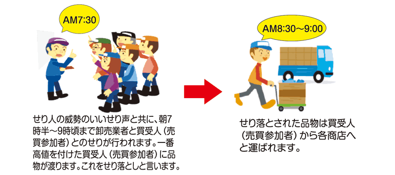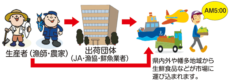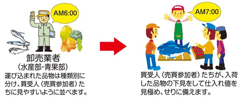そこで、市場では過剰な競争や、不正な取引を監視し、これらの生鮮食品等について、生産者や小売業者に公正な取引の場を提供し地域住民に安定して供給できるよう努力しています。 |